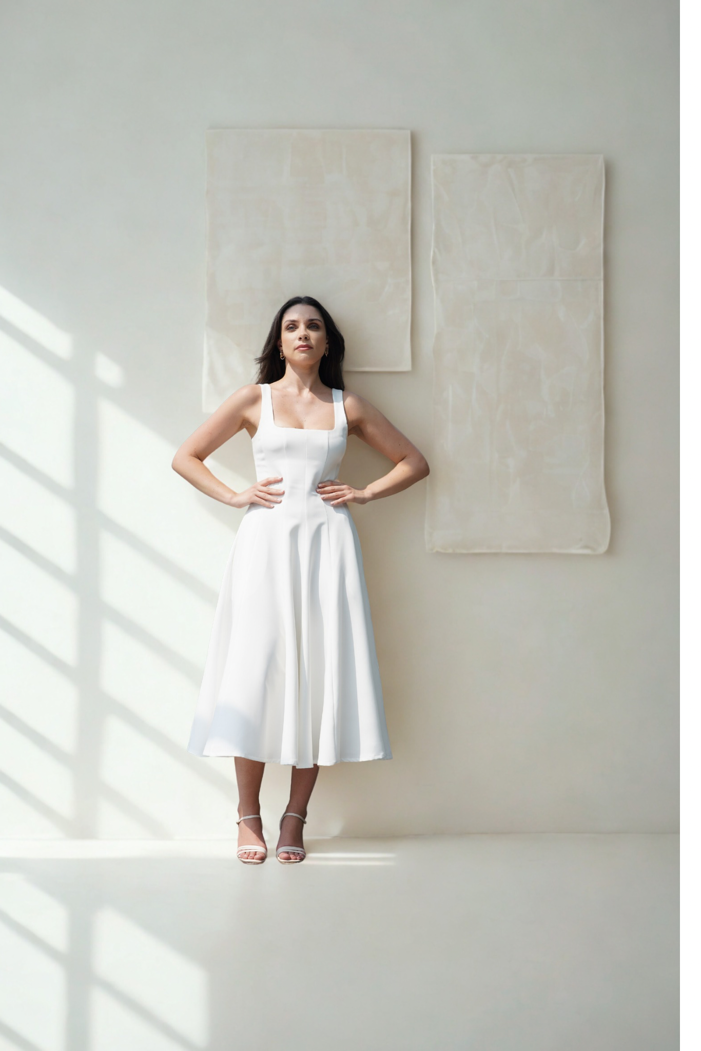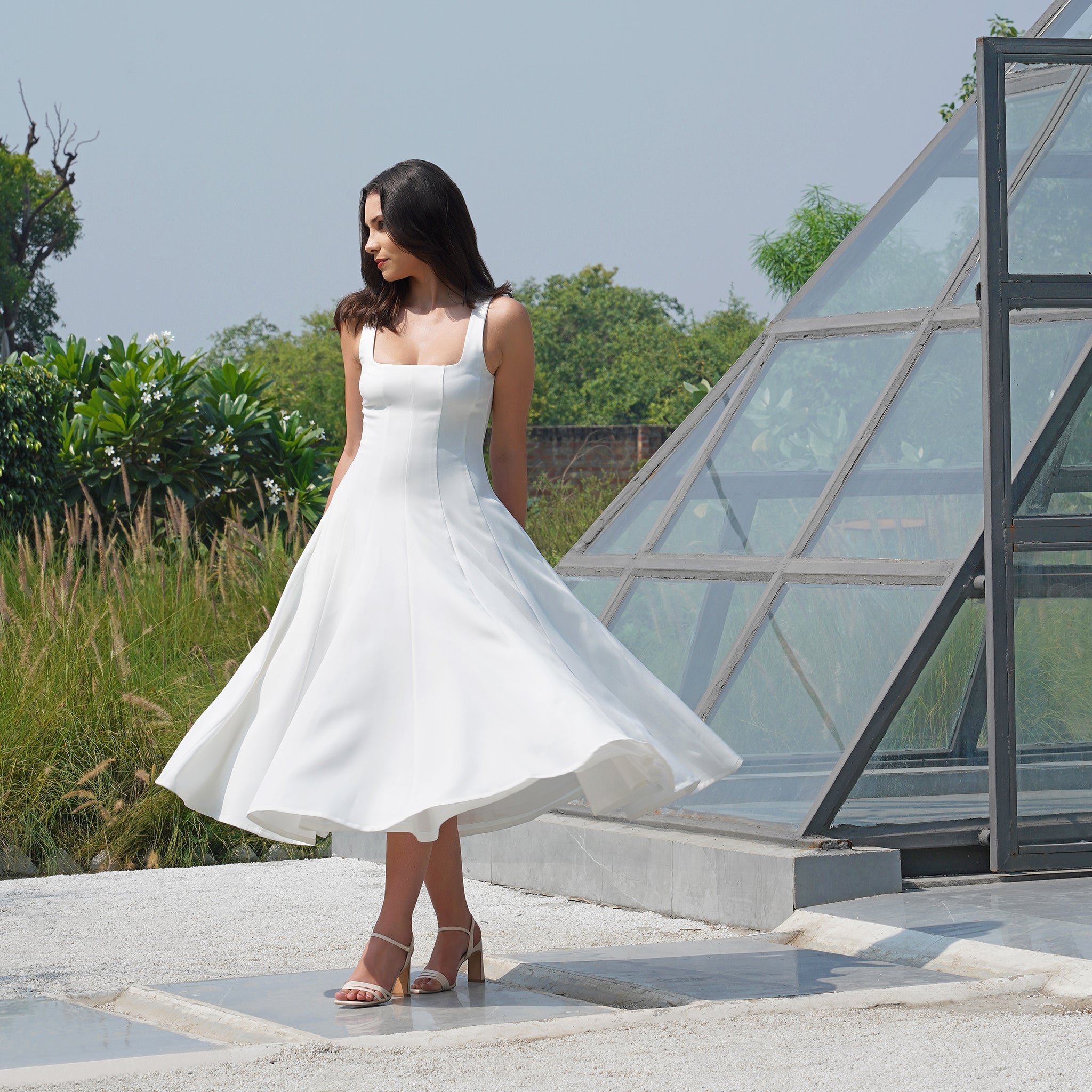 The Celeste Ivory Midi Dress redefines sophisticated dressing with its exquisite banana crepe fabric and flawless A-line silhouette. Designed for the modern woman who values both style and comfort, this dress features a structured yet flexible fit that moves gracefully.