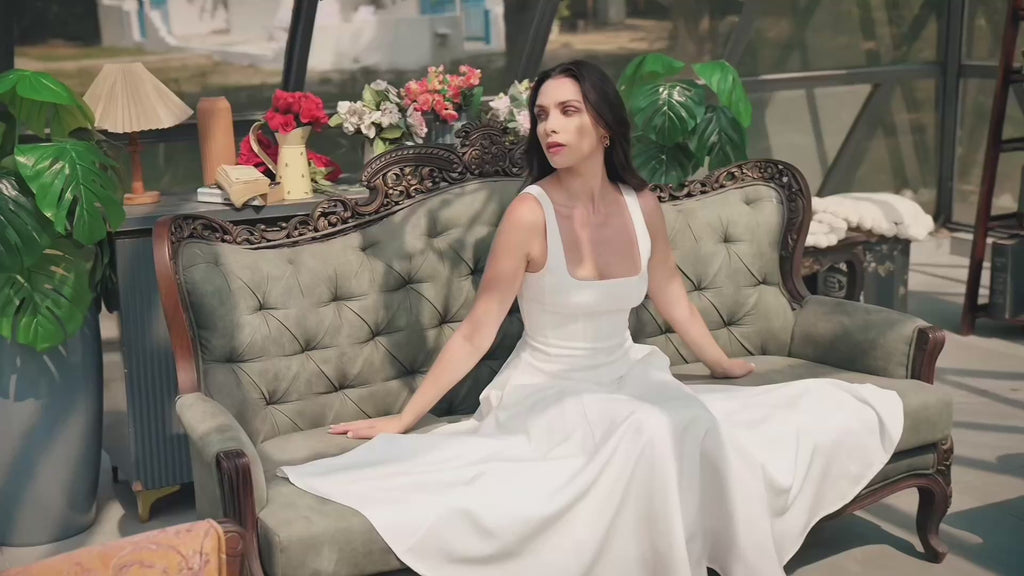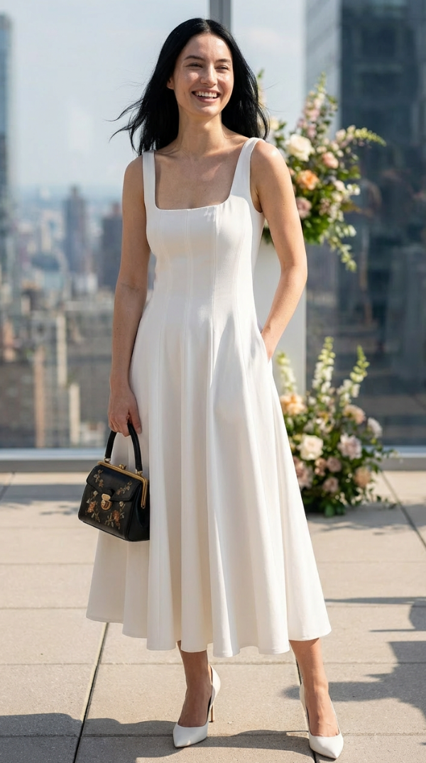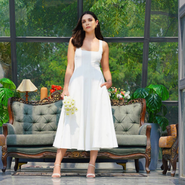 The Celeste Ivory Midi Dress redefines sophisticated dressing with its exquisite banana crepe fabric and flawless A-line silhouette. Designed for the modern woman who values both style and comfort, this dress features a structured yet flexible fit that moves gracefully.
