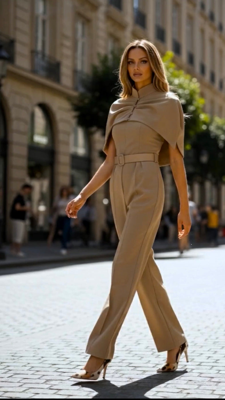 Discover the perfect blend of sophistication and versatility with our Oat Beige Square-Neck Jumpsuit with Cape. Crafted from premium crepe fabric, this jumpsuit features a flattering square neckline, structured belted waist, and a detachable cape for added drama.